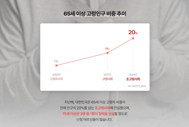 μ§λν΄ κΈ°μ€ νκ΅ 65μΈ μ΄μ κ³ λ Ήμ λΉμ€μ΄ μ 체 μΈκ΅¬μ 20%λ₯Ό λμ΄μ°λ€κ³ ν©λλ€.