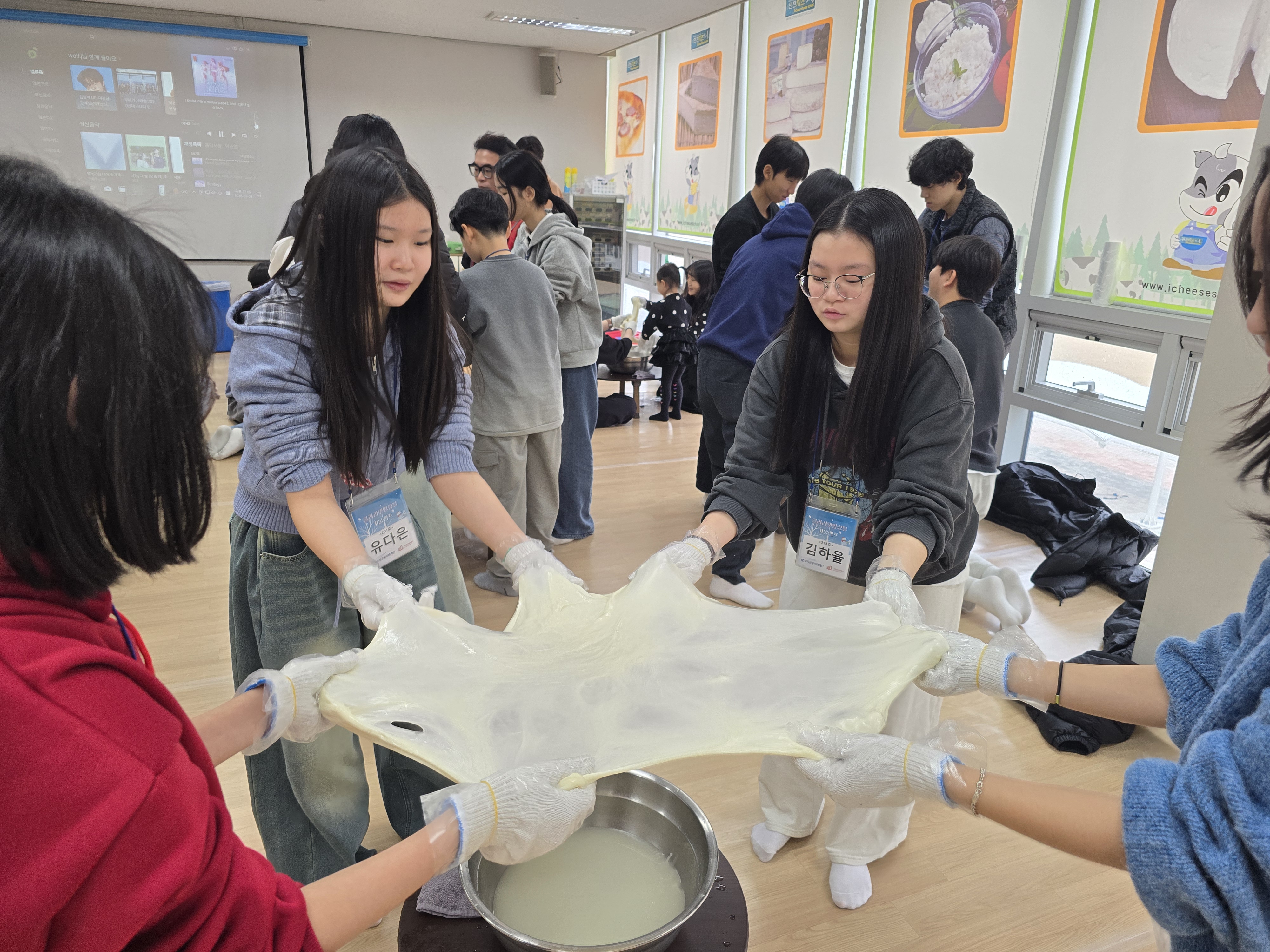 도착하자마자 앞치마를 두르고 본격적인 체험이 시작됐는데요. 잠시 후, 반죽을 주무르고, 치즈를 쭉쭉 늘리는 과정이 생각보다 쉽지 않은지 쑥덕대는 말소리가 들려옵니다.