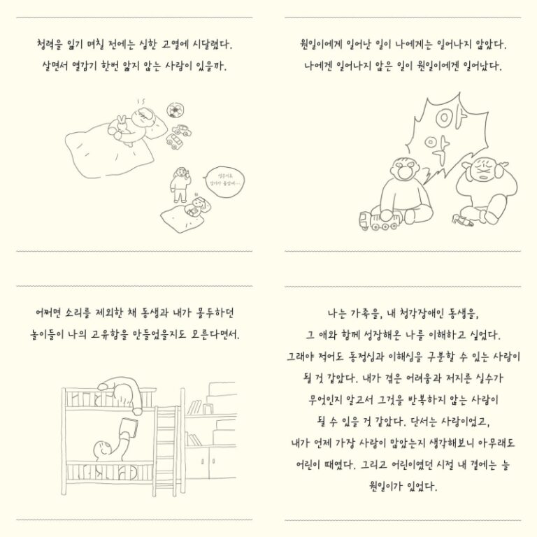 작가는 어릴 적, 죄책감과 책임감 사이에서 줄다리기를 합니다. 동생이 청각장애인이라는 사실을 인지한 후부터 죄책감을 느끼고 부모님으로부터 부여받은 보호자로서의 역할 때문에 어른스러워져야 했던 어린 시절의 억울함도 토로합니다.