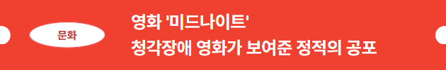 다음으로는 다시 돌아온 청각장애 문화 큐레이션으로 한국 스릴러 영화 '미드나이트'를 소개해 드립니다. 흔히 스릴러 영화라고 하면 날카로운 효과음이나 비명소리를 떠올리실 텐데요. 이 작품은 정적이 어떻게 관객들에게 숨 막히는 서스펜스를 선사하는지를 잘 보여주고 있습니다😱