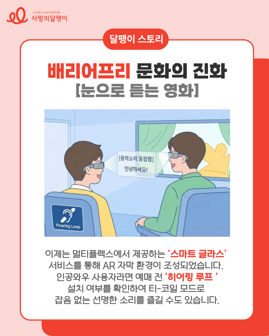 오늘 이어레터는 배리어프리가 어떻게 청각장애인의 문화생활을 변화시키고 있는지 영화부터 전시까지 전반적으로 다뤄보고자 합니다. '안 들려서 포기했던' 순간들을 '어떻게 즐길지' 고민할 수 있는 순간으로 변화시킨 다양한 기술의 발달을 사랑의달팽이가 카드 뉴스로 정리해 봤습니다👂