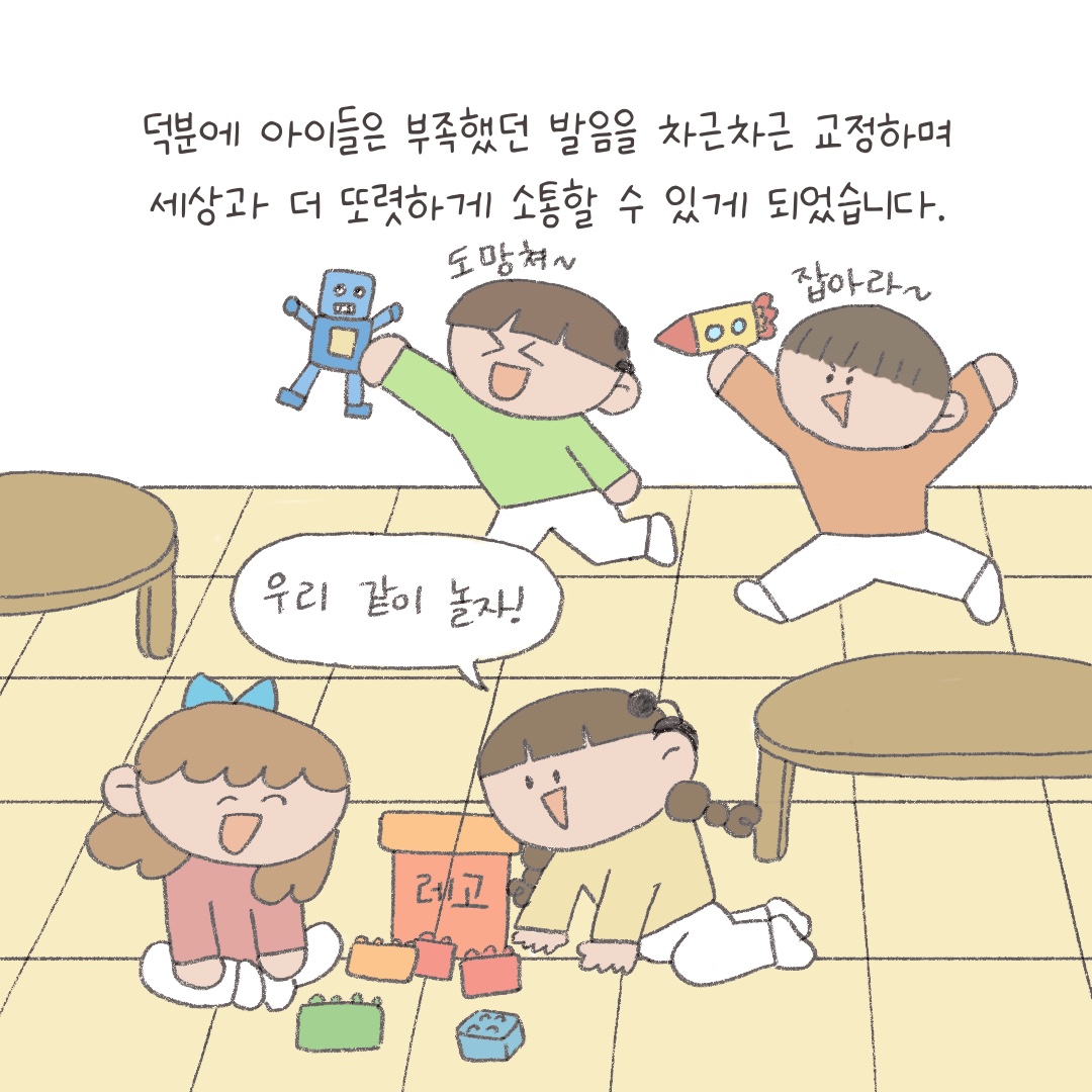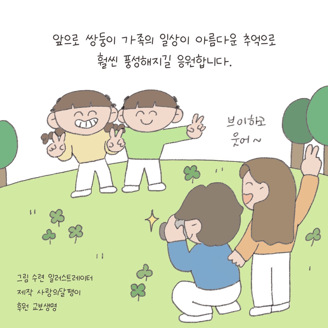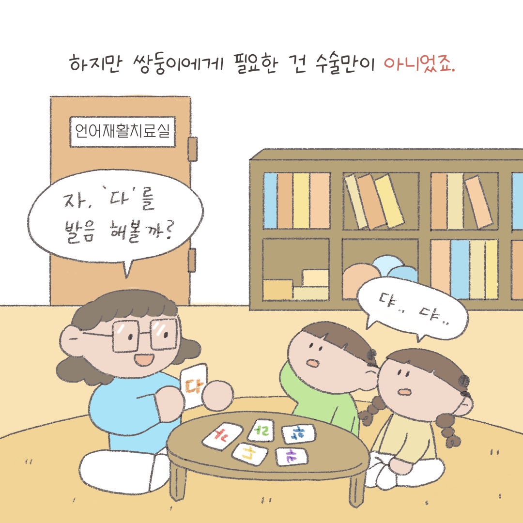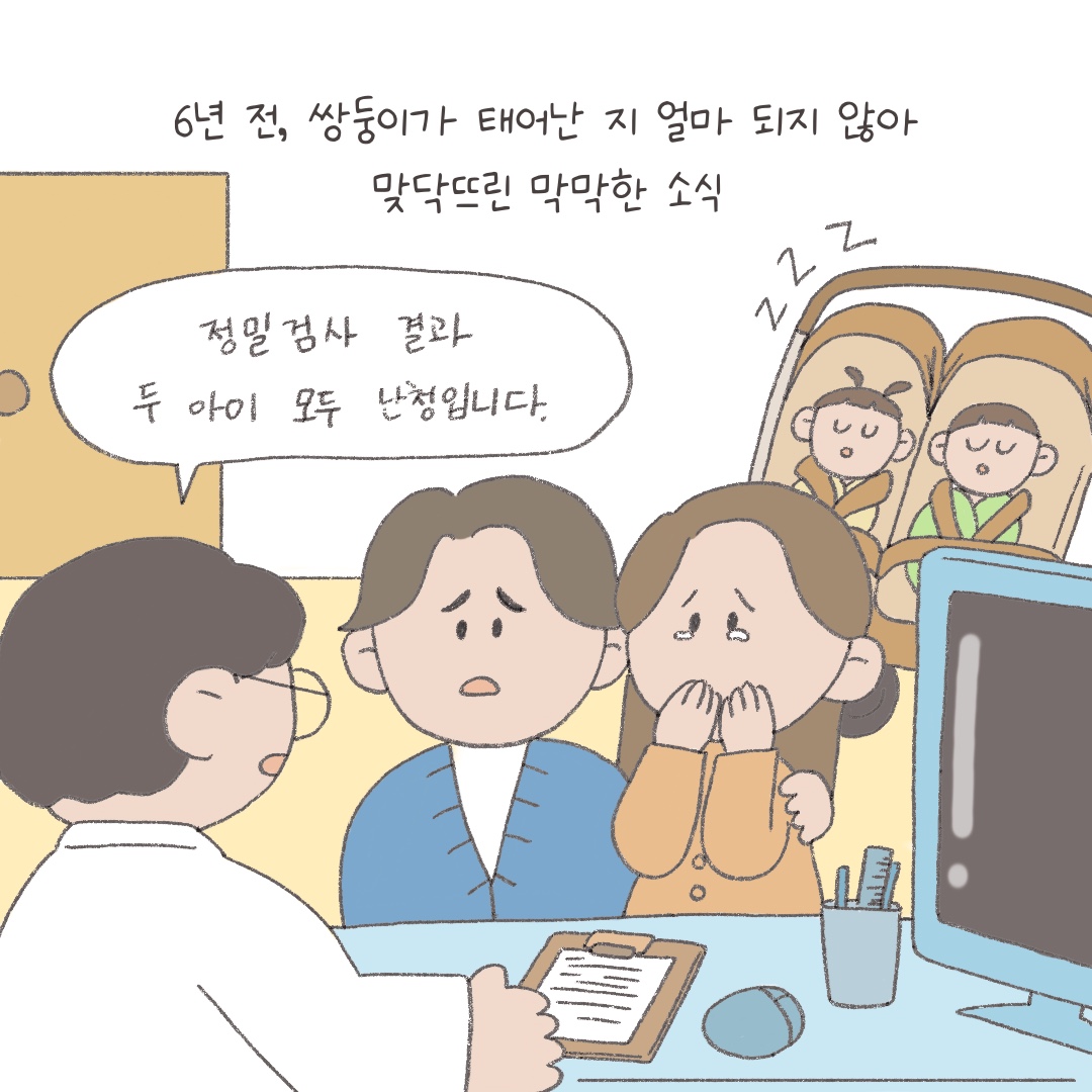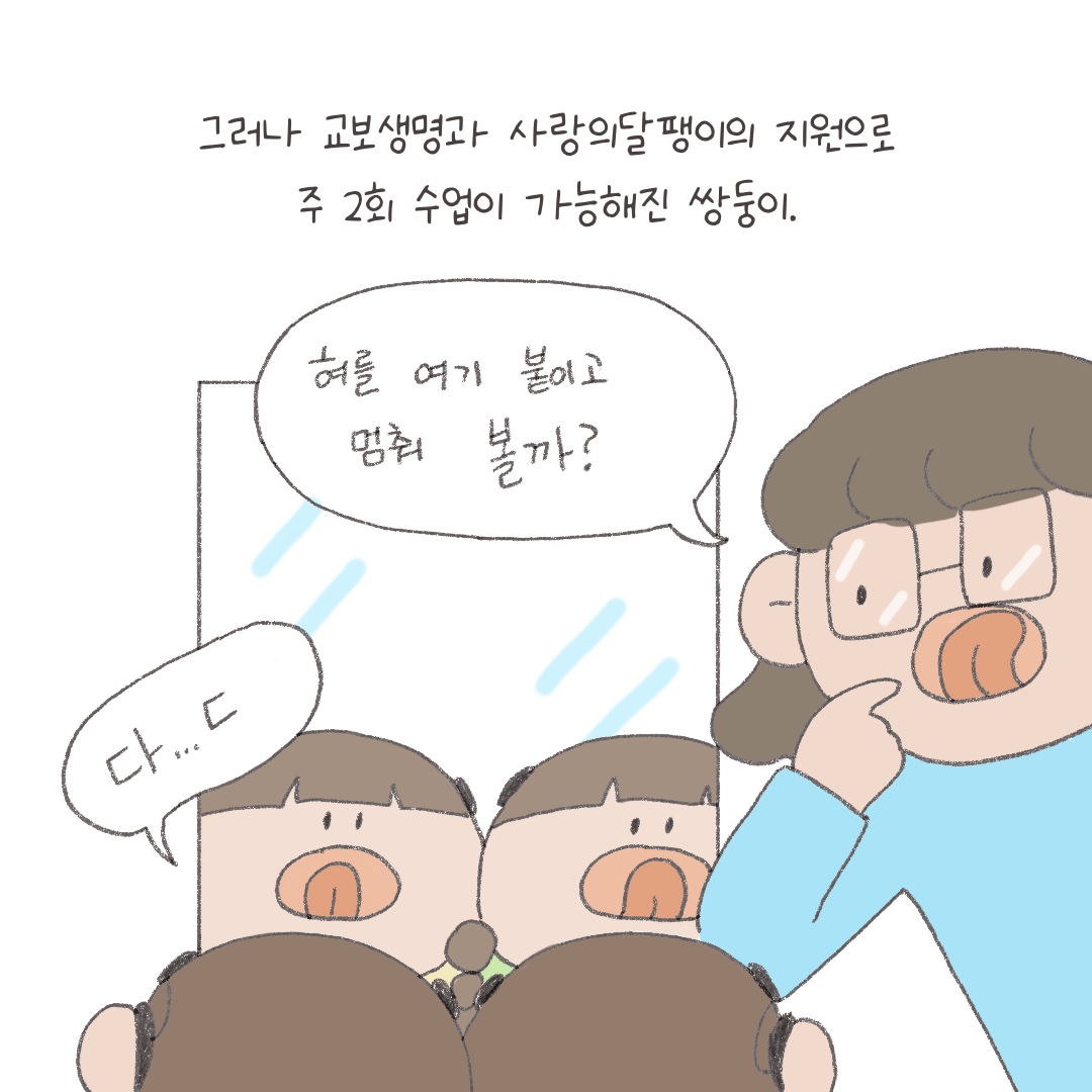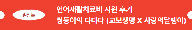 오늘 이어레터는 먼저 교보생명 후원으로 언어재활치료 지원을 받게 된 쌍둥이 영인이(가명)와 현성이(가명)의 지원 후기를 웹툰으로 전해드립니다. 사랑의달팽이를통해 주 2회 언어재활치료가 가능해진영인이와 현성이가 치료 열심히 받아서 장애를 딛고 자신들의 꿈을 맘껏 펼칠 수 있기를 응원하겠습니다😀